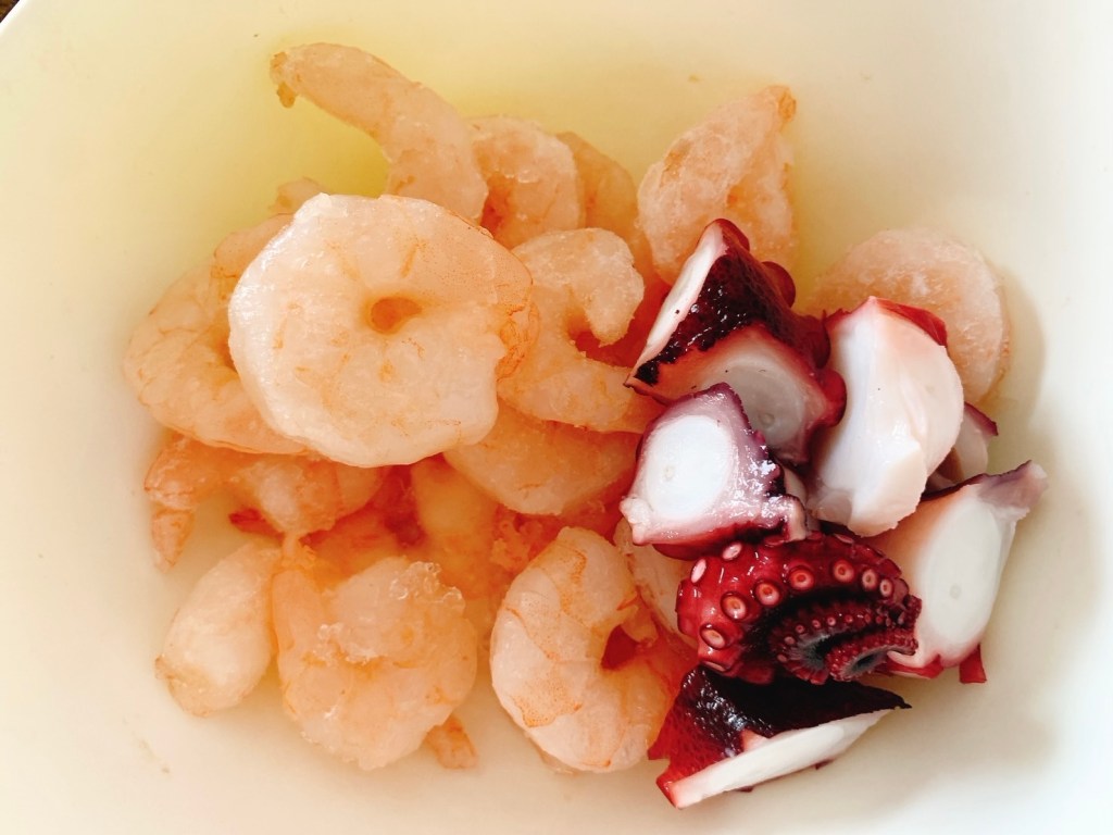 冷凍のエビにカットしたタコを加えて解凍しておきます。汁気を絞ったら塩コショウで下味をつけて、1時間ほど置いておきます。