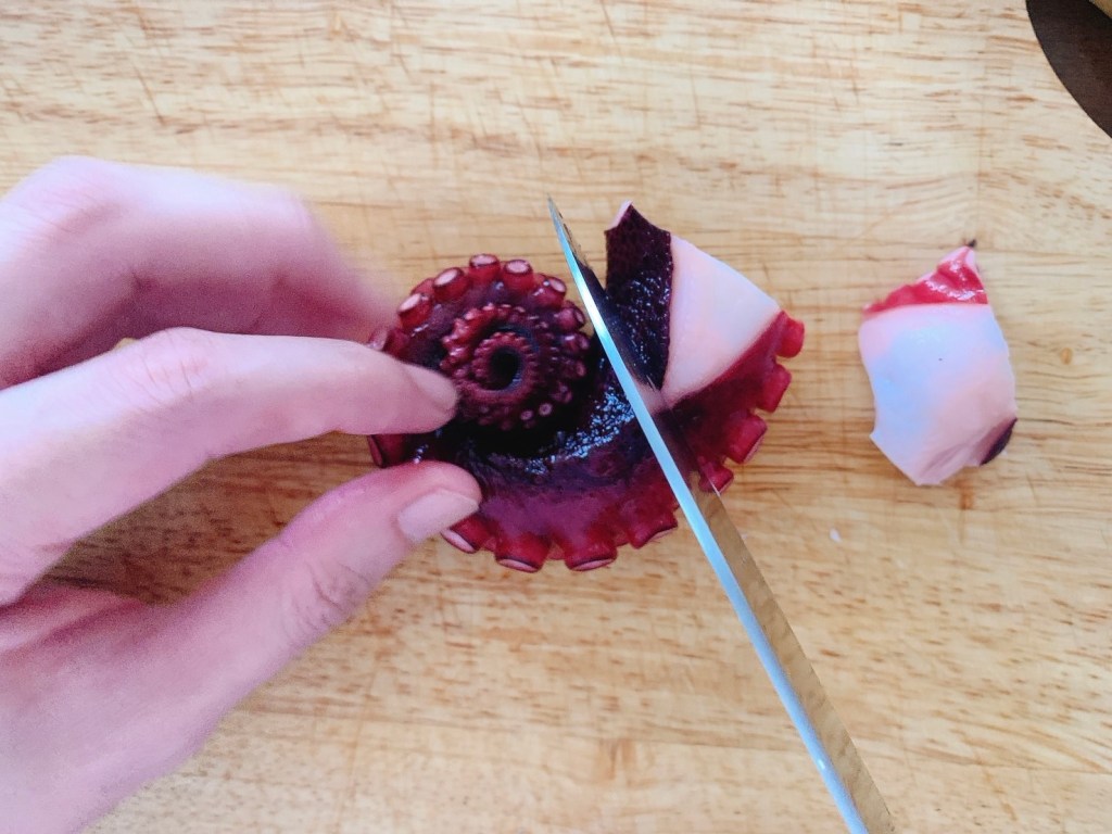 まずはタコさんをお好みの大きさにカットします。日本のタコの1/3はモーリタニア産です。繊細で歯切れが良く、クセがない味が最大の特徴と言えます。