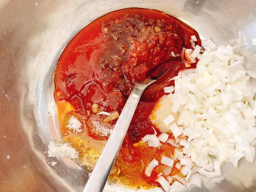 その間にソースを作ります。お好きな辛さで。今回は中華風に、トマトケチャップ、豆板醤、ゴマ油、鶏ガラ、にんにく、マヨネーズ、ネギ、あと隠し味にサテトムを入れました。ちょっとエスニックな雰囲気が出てとてもおすすめです。