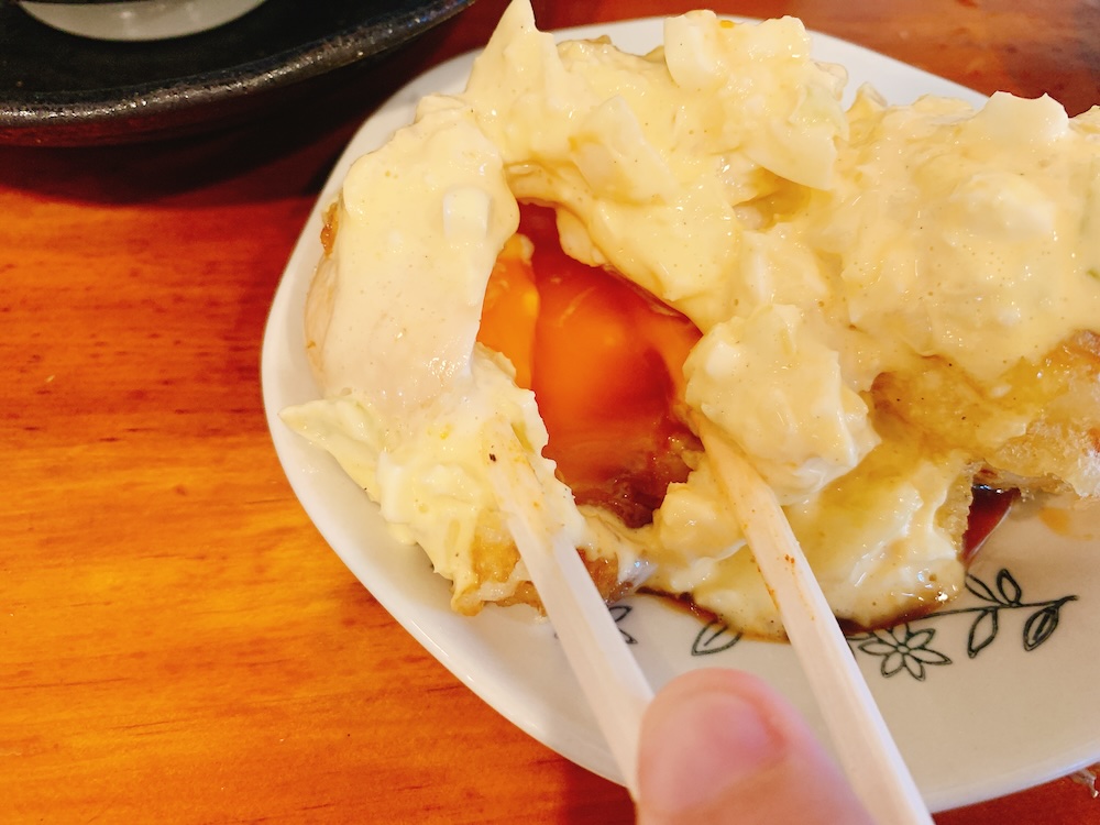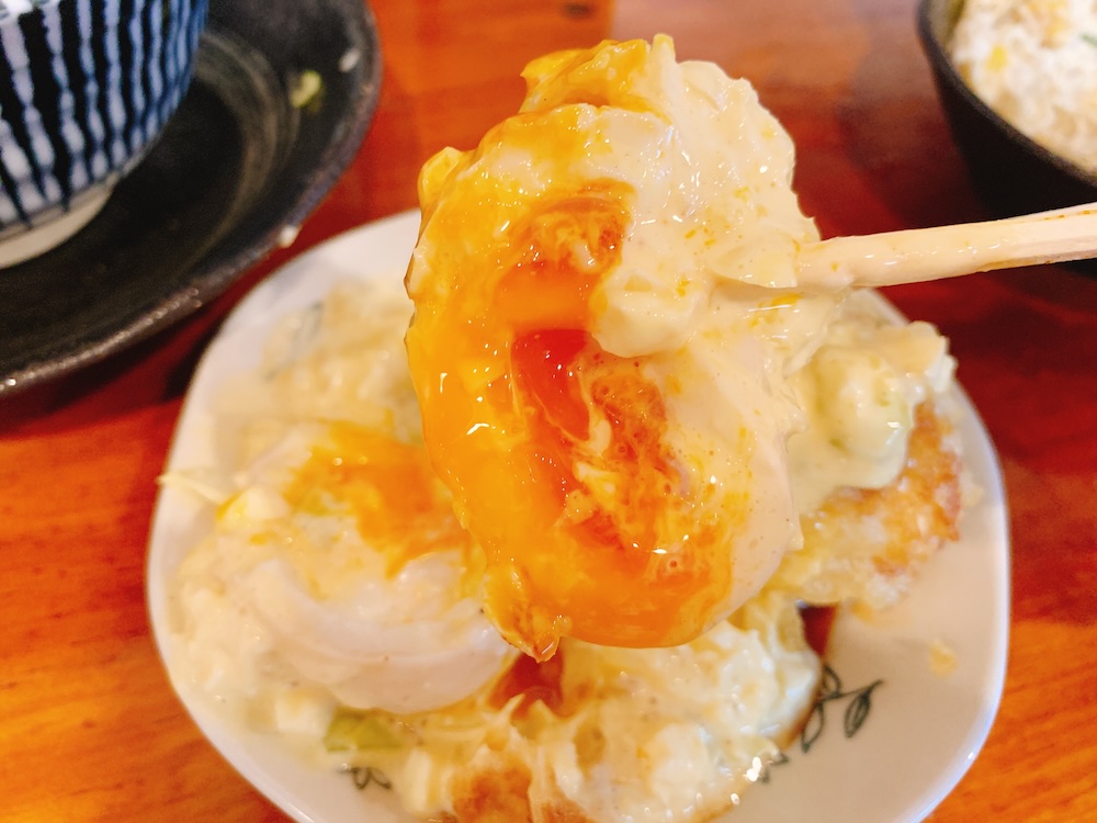 こちらも具材大きめで、揚げた半熟卵にたっぷりとかかっている。正直このタルタルだけでもじゅうぶん飲める。