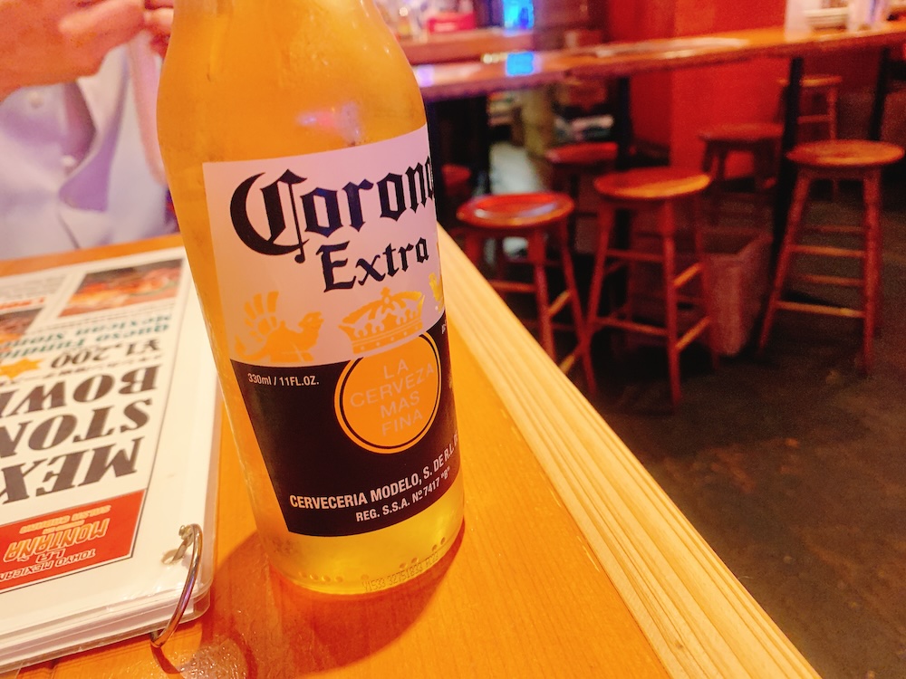 まずはコロナビールで、サルード!(メキシコの乾杯)(ド、を小さく発音するのがコツらしい)