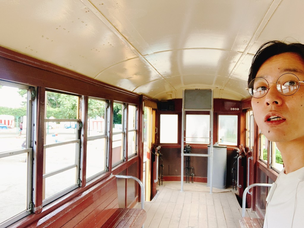 運転席にも入れるぜ。昭和47年まで実際に走っていたものらしい。