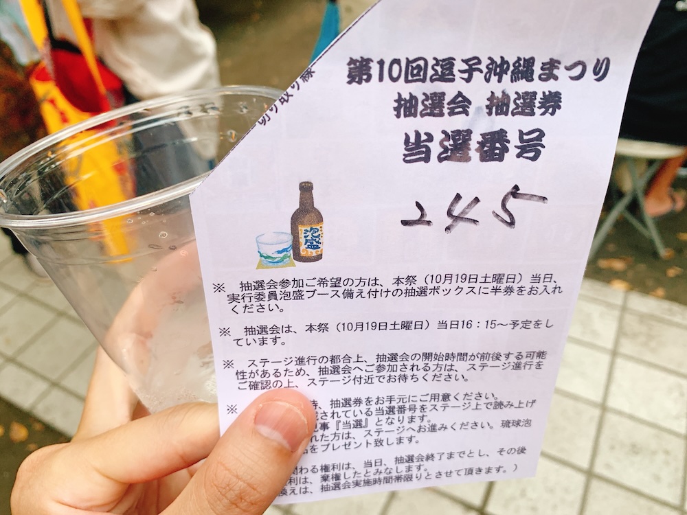 1杯だけね〜と思ったら、「3種類飲んで1200円!泡盛のボトルが当たる抽選券付きだよ!もう抽選始まるよ!」という、うちなーの軽快な口車に乗せられて買ってしまった飲み比べチケット。