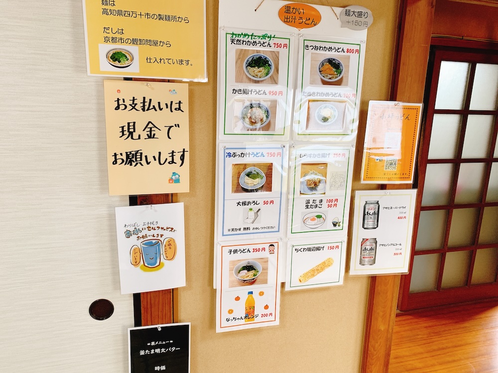 メニューはうどん各種とトッピング。お酒はスーパードライがある。