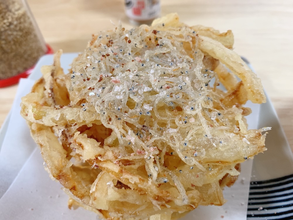 かき揚げの衣はサクサク、中は玉ねぎが甘くてみずみずしい。