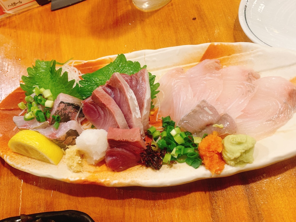 自分で選べる刺し盛り(写真は3点盛り)に付いている薬味やわさび、もみじおろしもこの通り。刺身の鮮度はいうまでもない。左から、アジ、ブリ、ヒラメ。