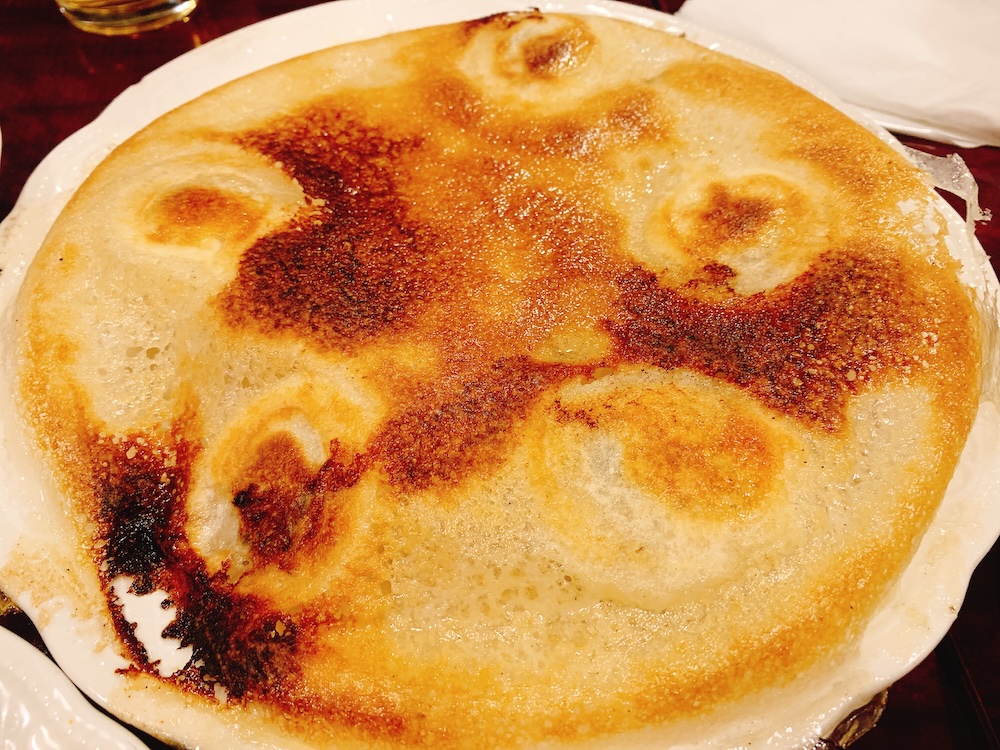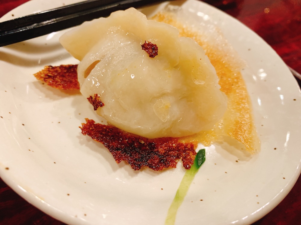 羊肉焼き餃子。羊肉を使った餃子は日本では珍しい。パリパリの羽付きタイプ。