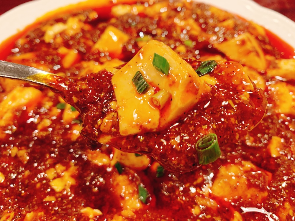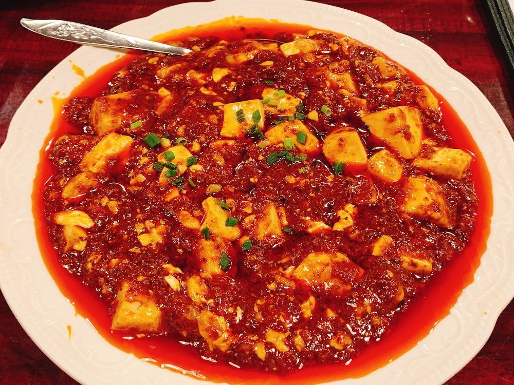 花椒ガッツリ系。しかし(最近流行りの)痺れや辛さだけではない、味噌っぽいコクと旨み、複雑な食感、トウチの風味も効いている。時折ジャリっと歯に当たるスパイスの食感がたまらない。口の中いっぱい、情報量の多い四川麻婆豆腐に支配される快楽に溺れよう。痺れてきた舌の上を冷たい青島ビールが、滑らかにスライドしていく。山椒の痺れとの相互作用で、いつもよりビールが甘く感じる。