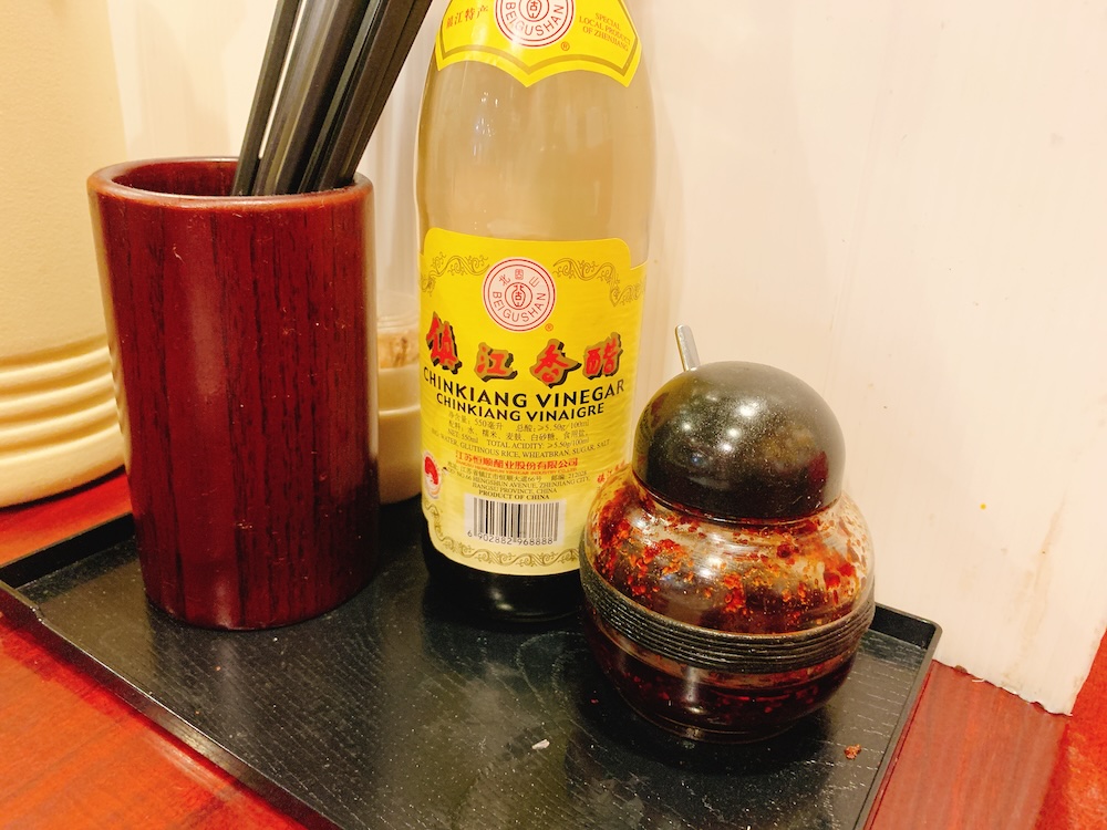 テーブルには自家製ラー油と、香醋。香ばしくて美味しいよ、ラー油。気に入ったら買って帰ることもできる。