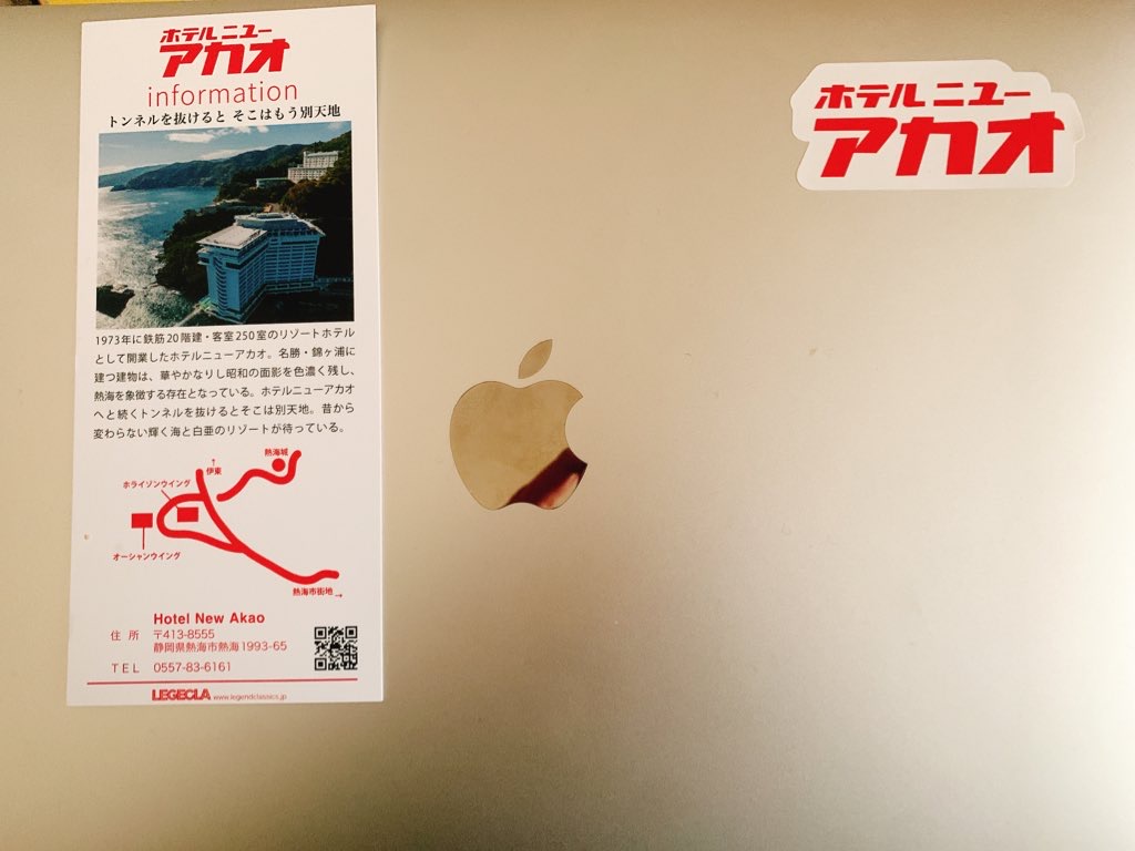 売店のお姉さんにもらったホテルニューアカオステッカー。早速仕事用のMacBookに貼ってみた。