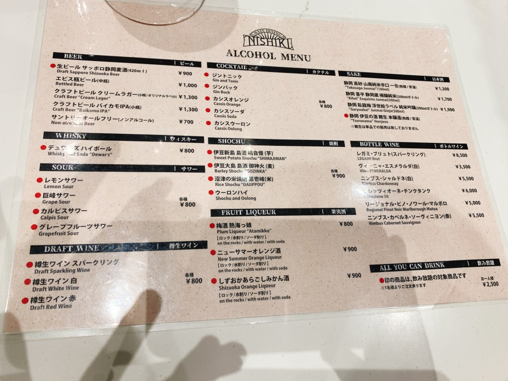 アルコールは別料金。我々は飲み放題プラン。3杯飲むならお得だが、首から「飲み放題」という札を下げる必要があってちょっと恥ずかしい。