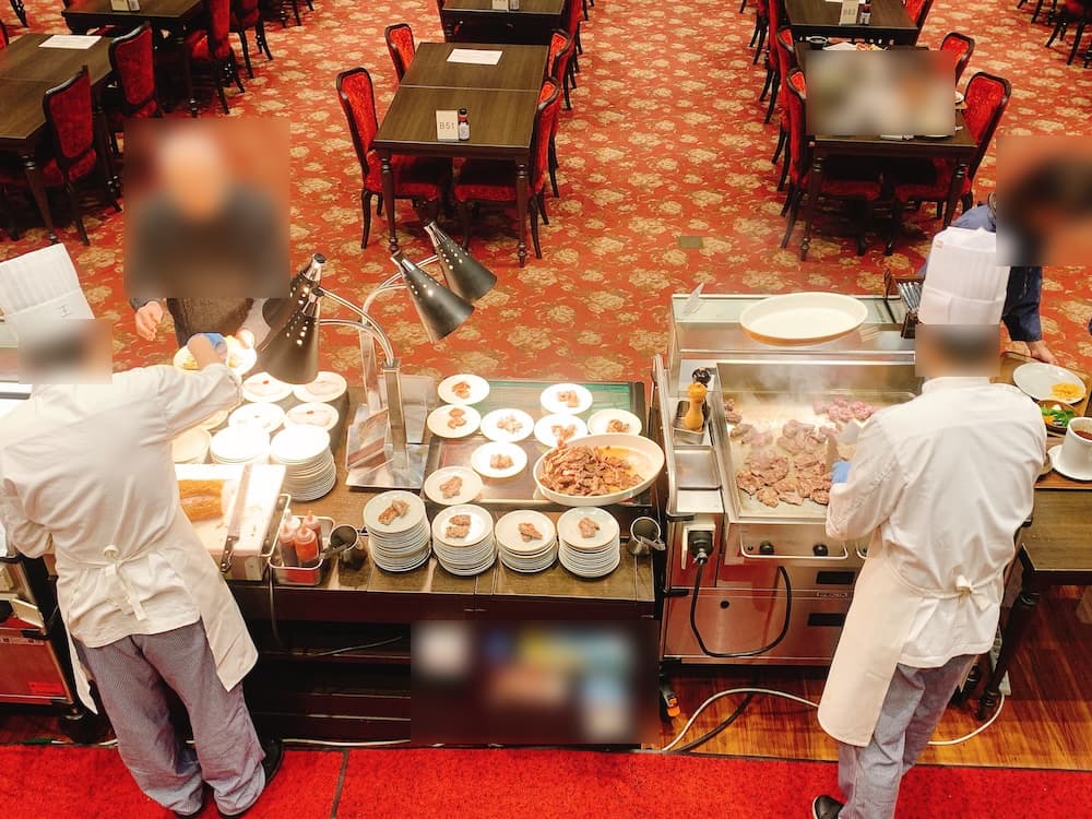 ステーキや揚げ物はライブキッチンで。ちょうど肉が焼けるのを見下ろせる特等席に通してもらった。