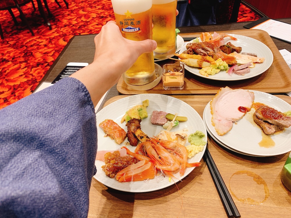 ちょっと食べ物の量が弱気に見えるが、この後4回くらい取りに行ったのでご心配なく。