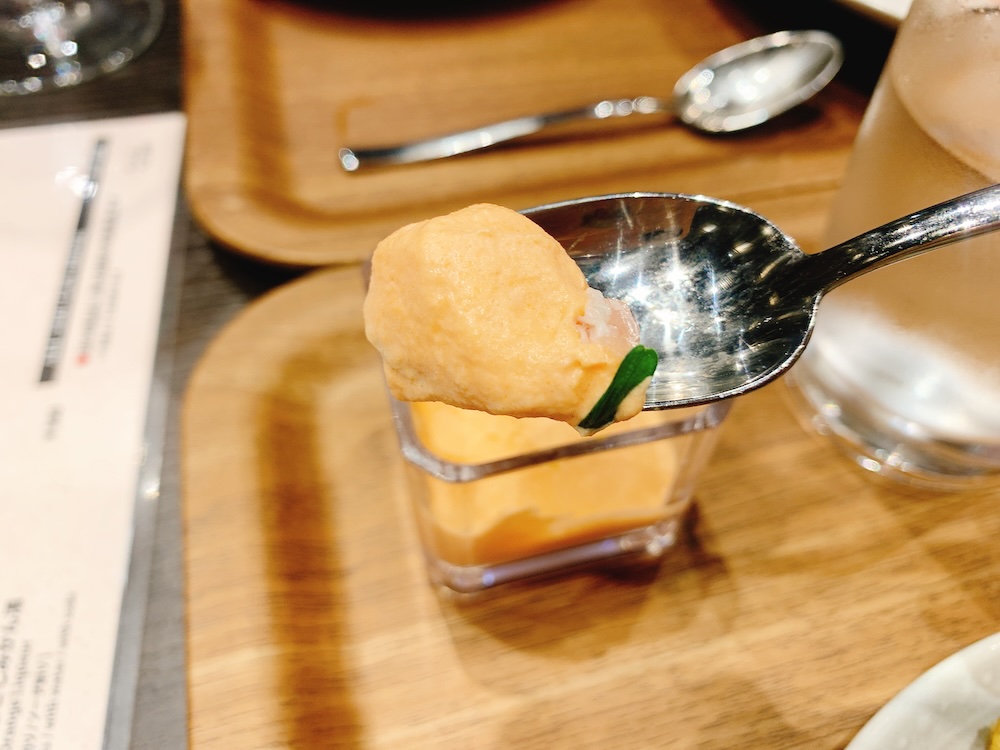 口の中で溶ける雲のように軽い食感のその奥に、人参と、何かしらのスパイスの香り。ちょこんと乗った生ハムのほのかな塩気。食べても胃にたまらないテクスチャと相まって、ワインのつまみとして完璧なバランスを実現していた。