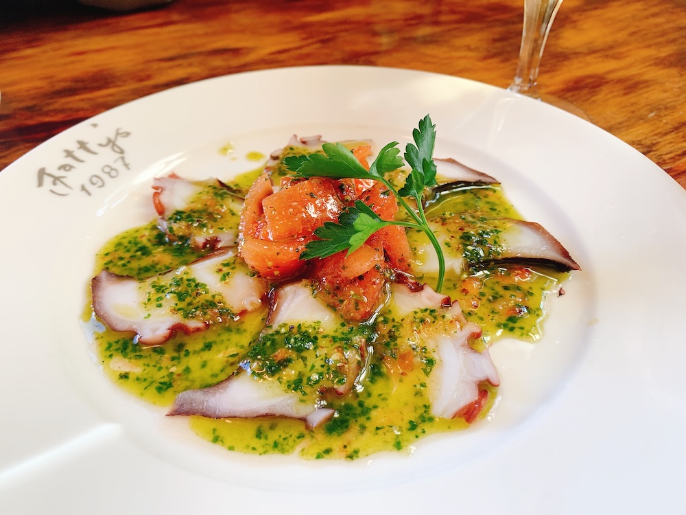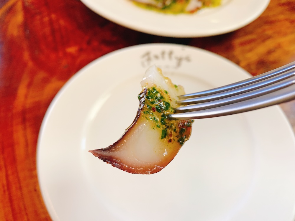 花のように美しく盛り付けられた、地だこのマリネ。お皿に刻まれたロゴが可愛らしい。1987年といえば、俺とほとんど同い年だ。