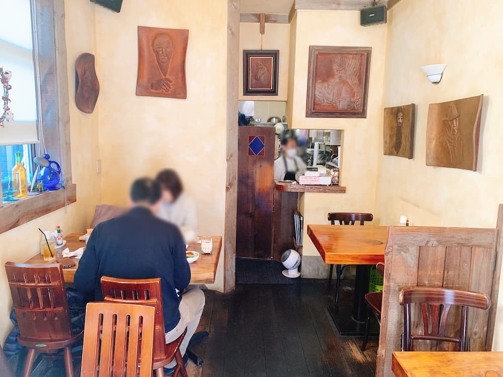 食欲そそる香りが漂う店内。テーブル席が4席のみ。木の質感と差し込む日差しが暖かい。