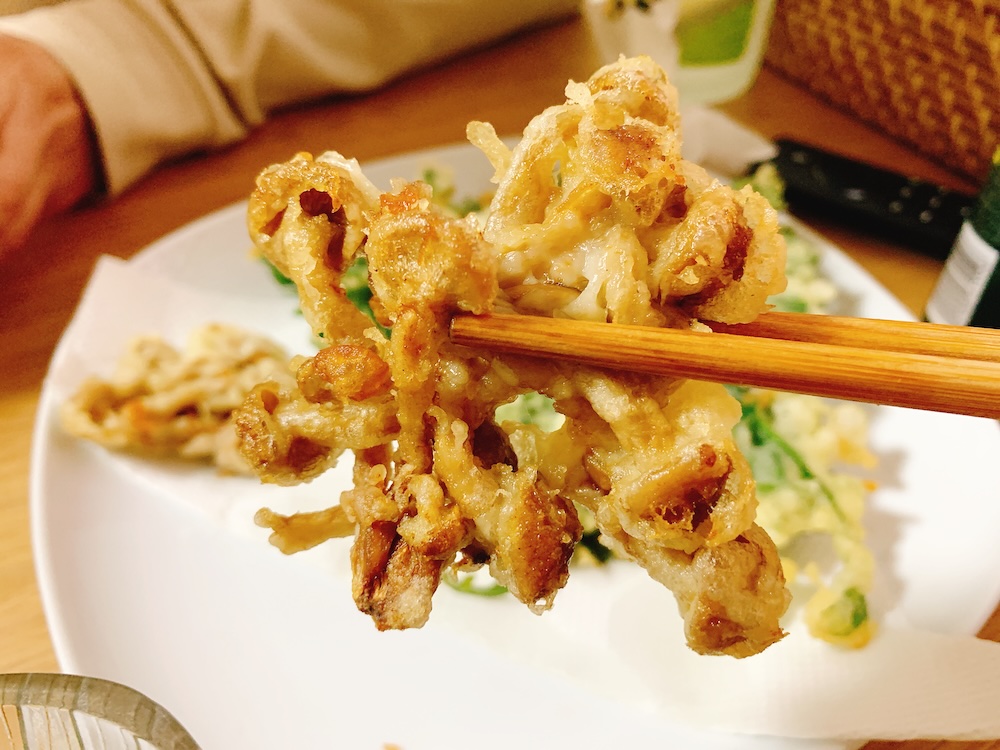 大きなナメコは天ぷらに。初めて揚げたけど、味噌汁に入れなくてもヌメりが楽しめて、これは新しい発見だったな。