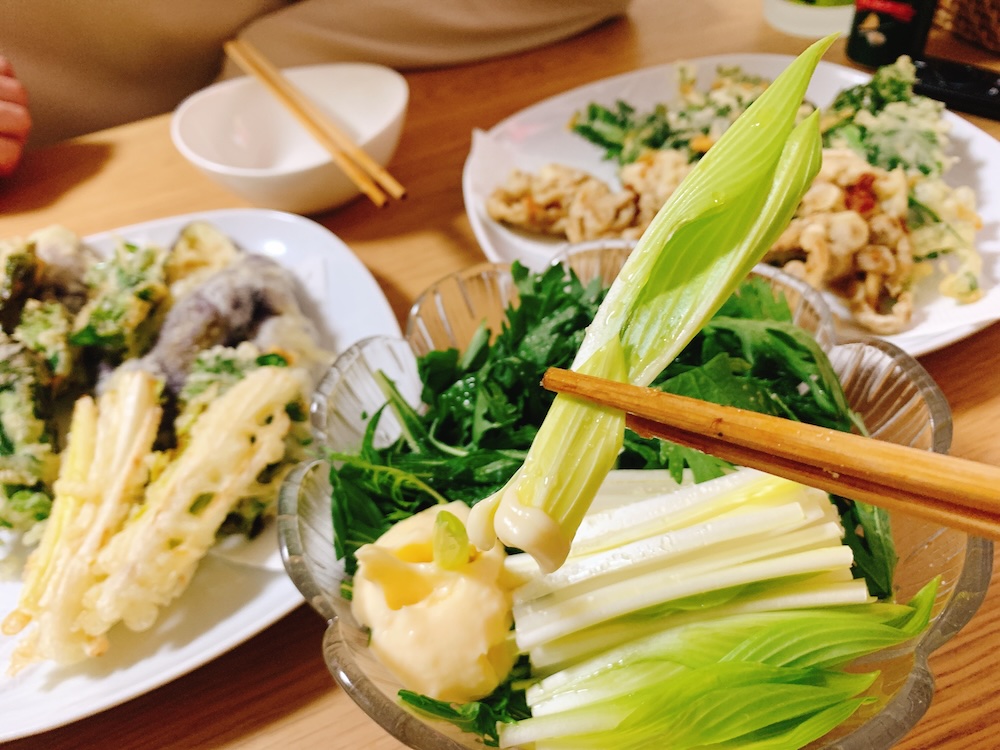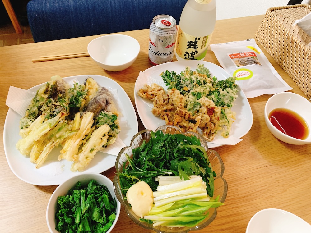 同じ東京なのに、野菜の値段や質が全然違うね。天ぷら、サラダ、おひたしで乾杯!