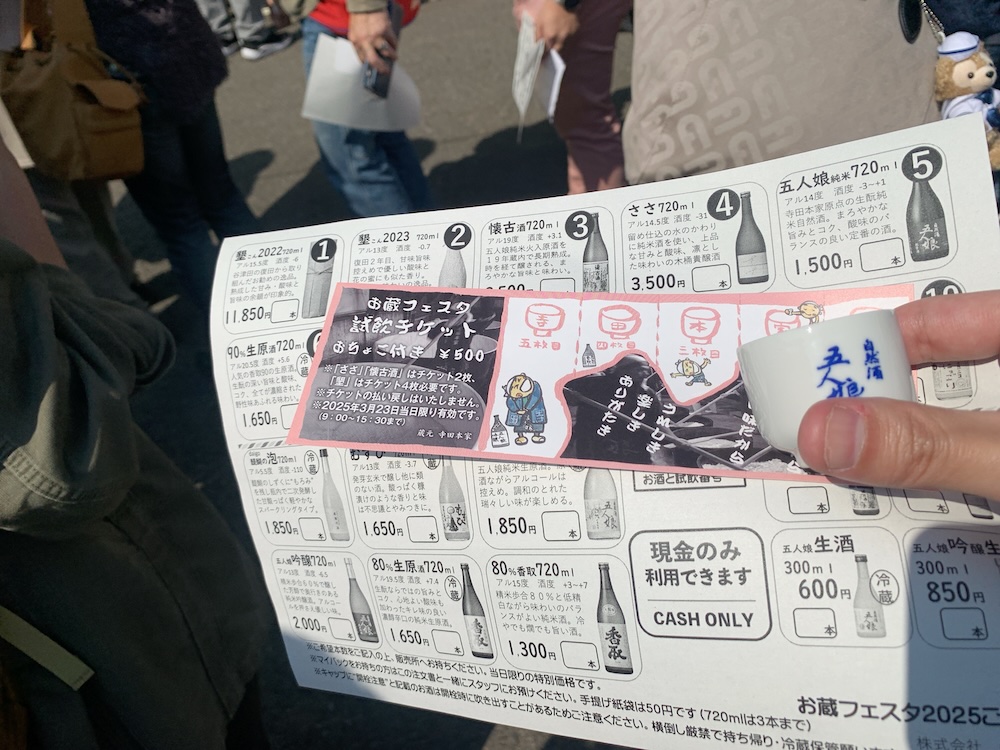 500円で5枚綴りの試飲券、お猪口がもらえる。