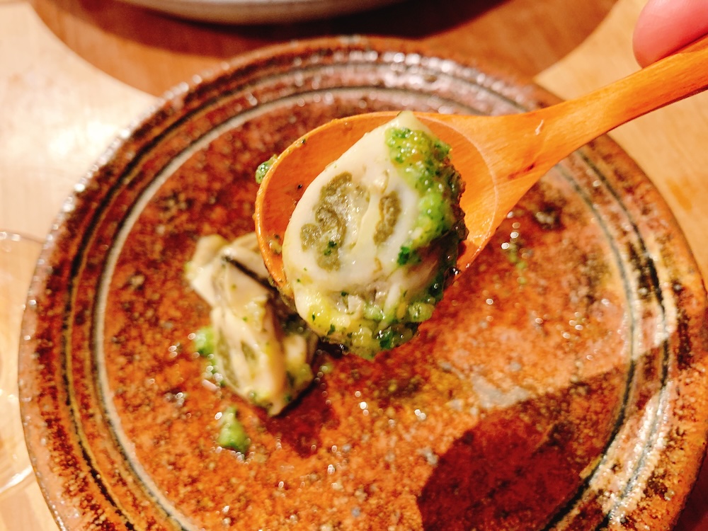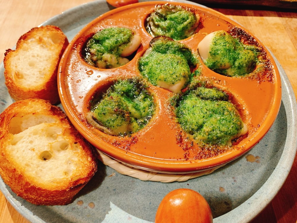 牡蠣のエスカルゴバター焼き。バゲット添え。