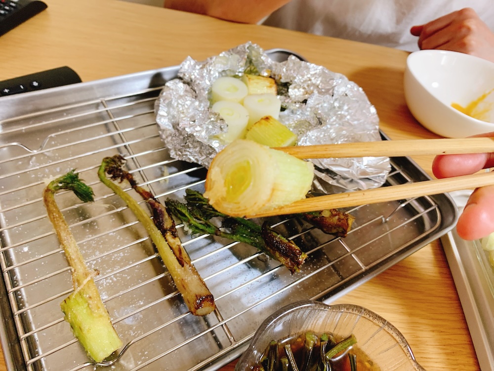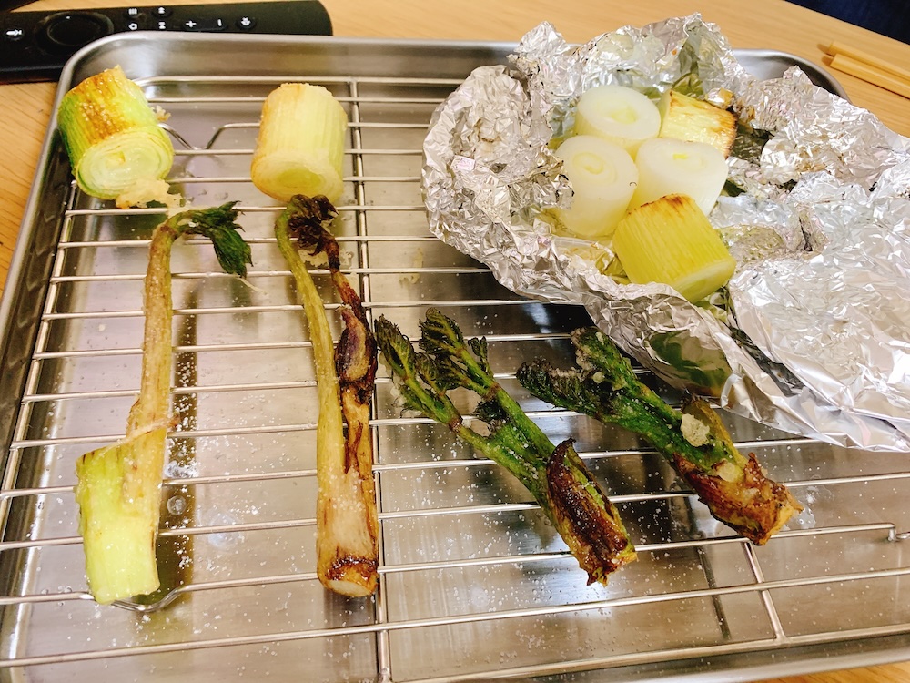 ネギはグリルでホイル焼きも。ぶっといので、なかなか火が通らなかった。