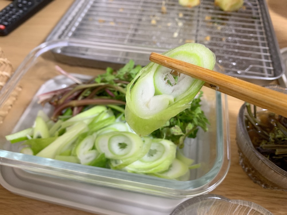セリの根っこは綺麗に洗っておひたしに。この部分が1番香りが強くて美味い。