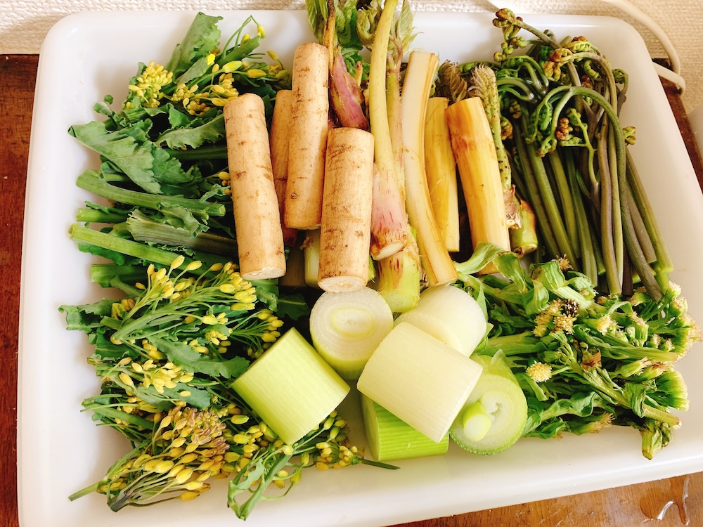 深谷ネギの他には、菜の花、ごぼう、わらび、うど、たらの芽、セリ、ふきのとう、椎茸など、春の味覚が潤沢に手に入った。