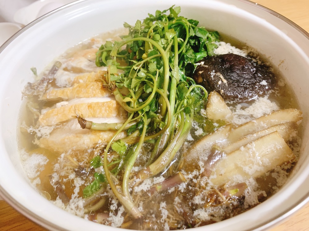 セリと、鶏肉、ごぼう、椎茸、深谷ネギ、しらたきのお鍋。
