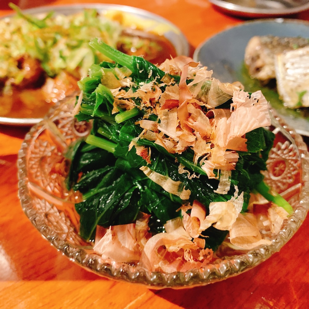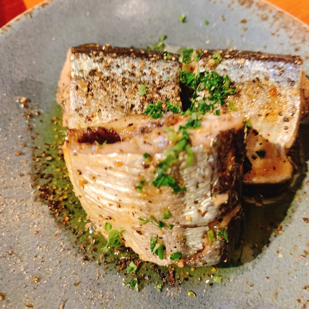 左から、明日葉のお浸し、おつまみ純レバ、秋刀魚のコンフィ。